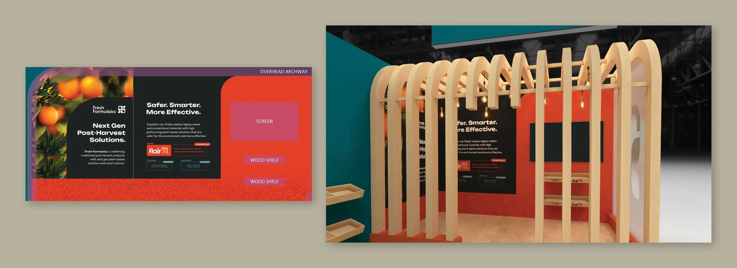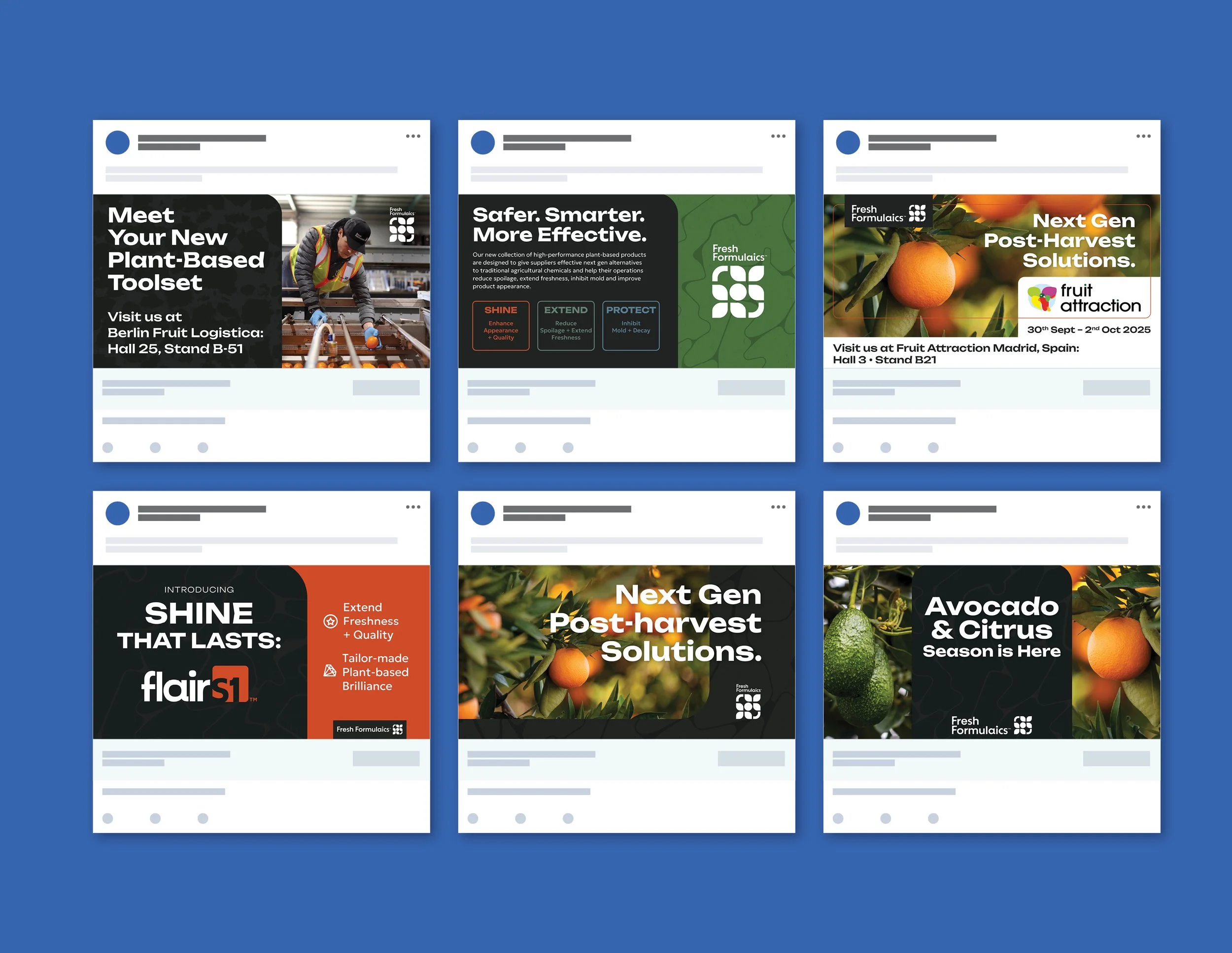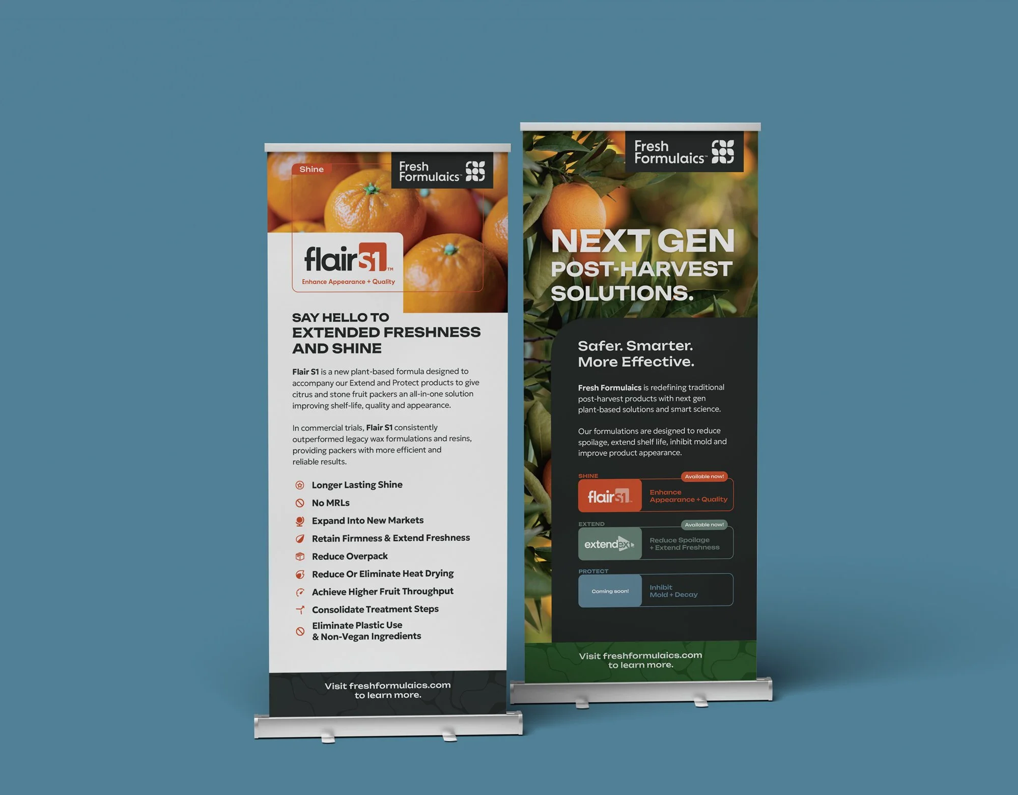 Building on the moodboard and direction provided by the agency, we designed and produced all necessary collateral for the launch. This included sales one-pagers, newsletters, rollup banners, branded swag, and launch graphics for LinkedIn and trade publications. At Fruit Logistica, the booth featured a dedicated section to give attendees a first look at the new product line, while visual consistency across every touchpoint reinforced the Fresh Formulaics identity. Our focus was on striking a balance between clarity and impact, presenting technical benefits in a way that felt approachable, premium, and aligned with the brand’s sustainable ethos.
