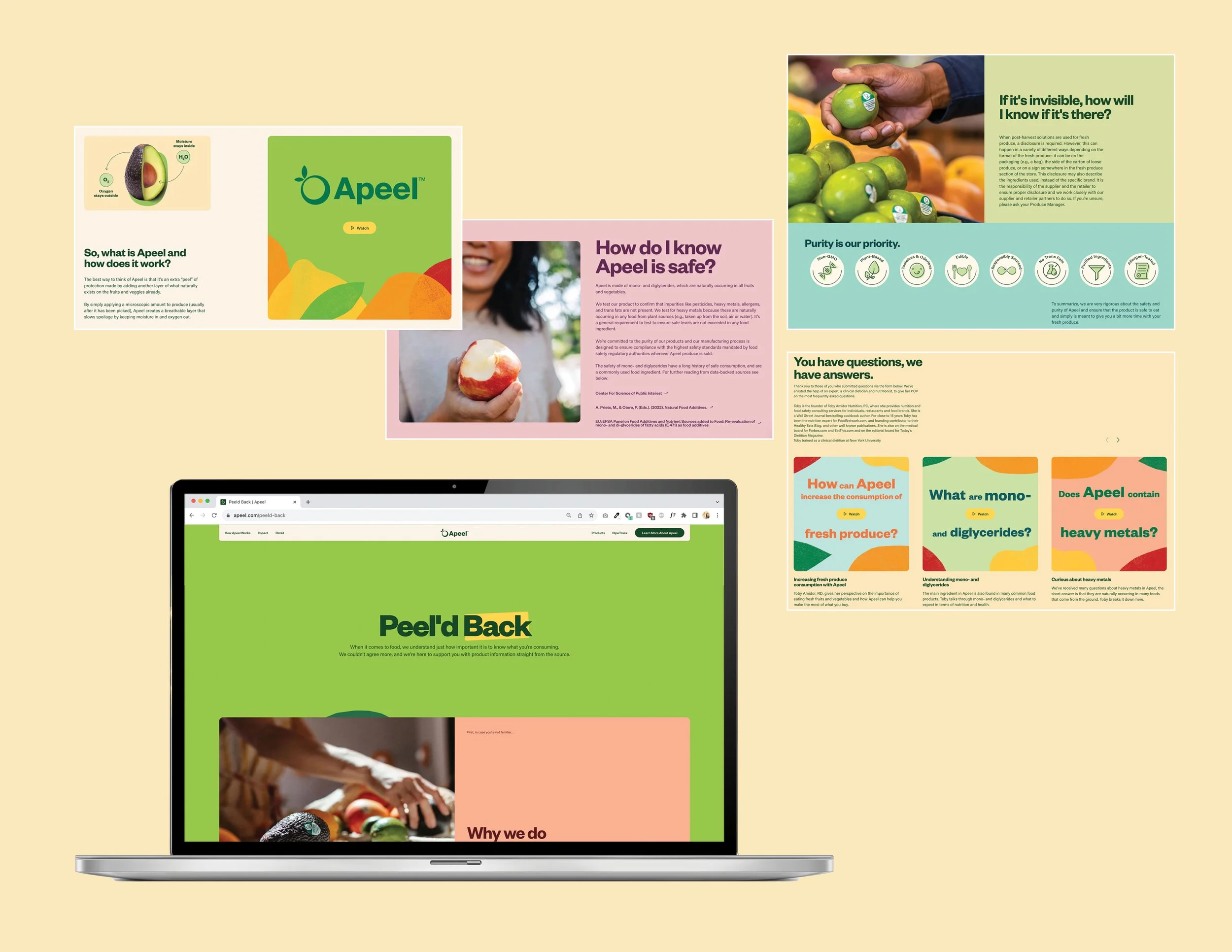 We came to a consensus on the mission of enhancing transparency by “unpeeling” Apeel’s product to reveal its details. Guided by this idea, we created Peel’d Back as a cross-channel platform with a central landing page that consolidated answers to the most common consumer questions—what Apeel is made of, how it works, and where its ingredients come from. The visual identity drew from Apeel’s existing brand language while introducing warm, organic shapes and muted colors to balance the science with a more approachable, human touch. Infographics, diagrams, and icons simplified complex concepts, helping consumers understand the benefits without feeling overwhelmed by technical detail.
