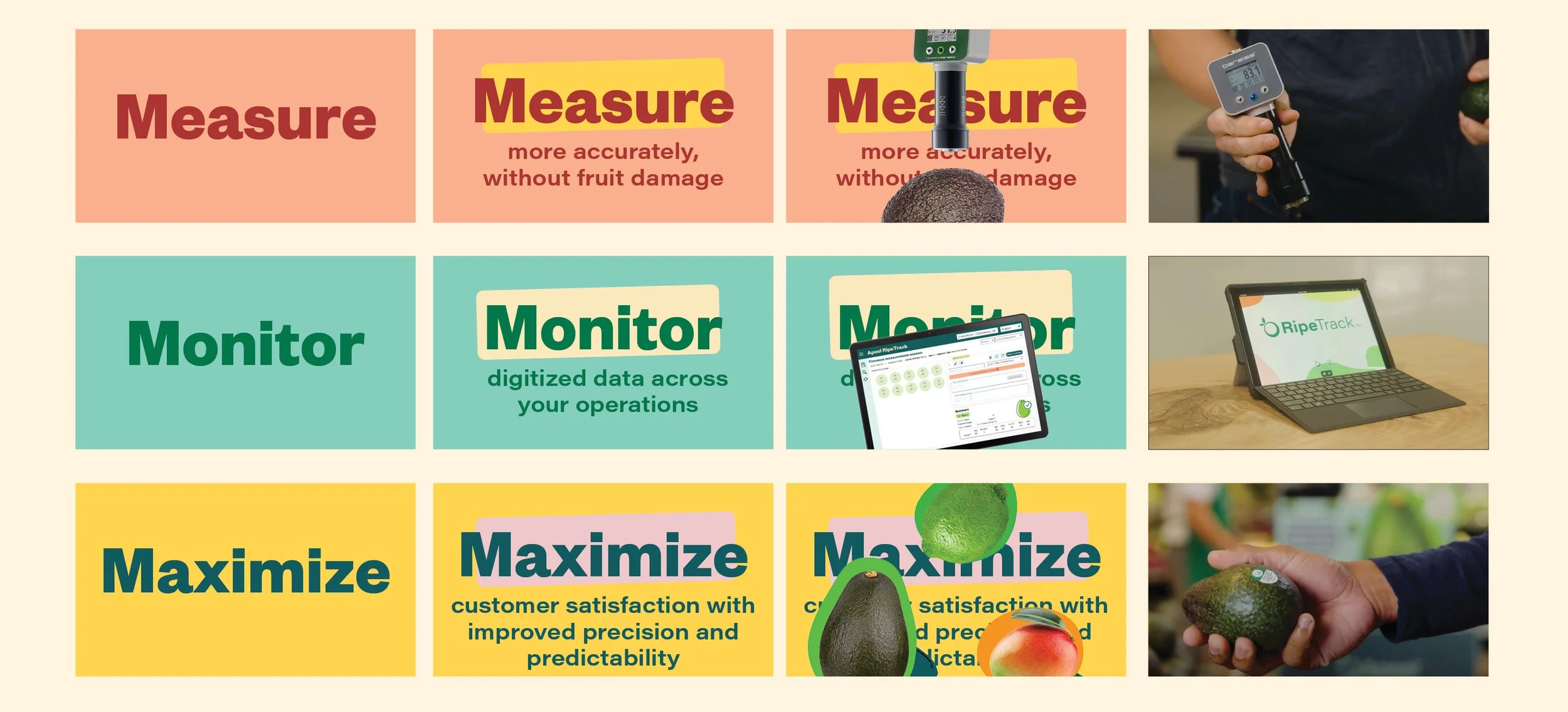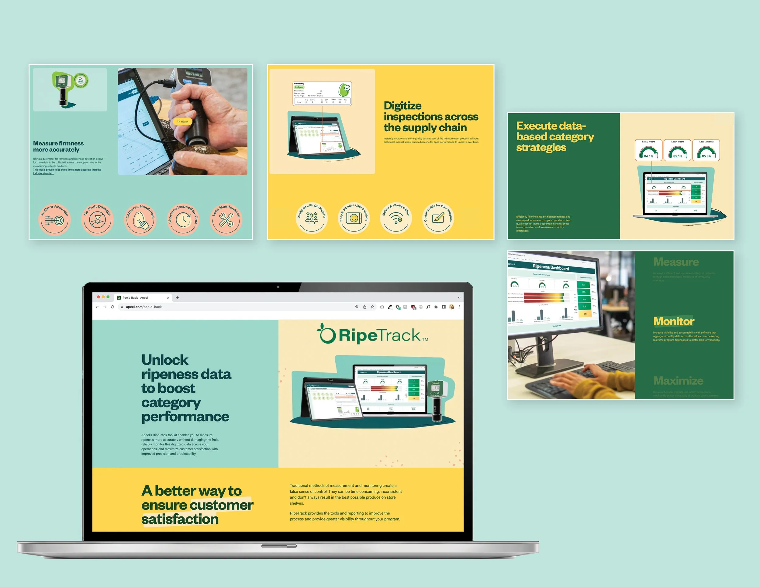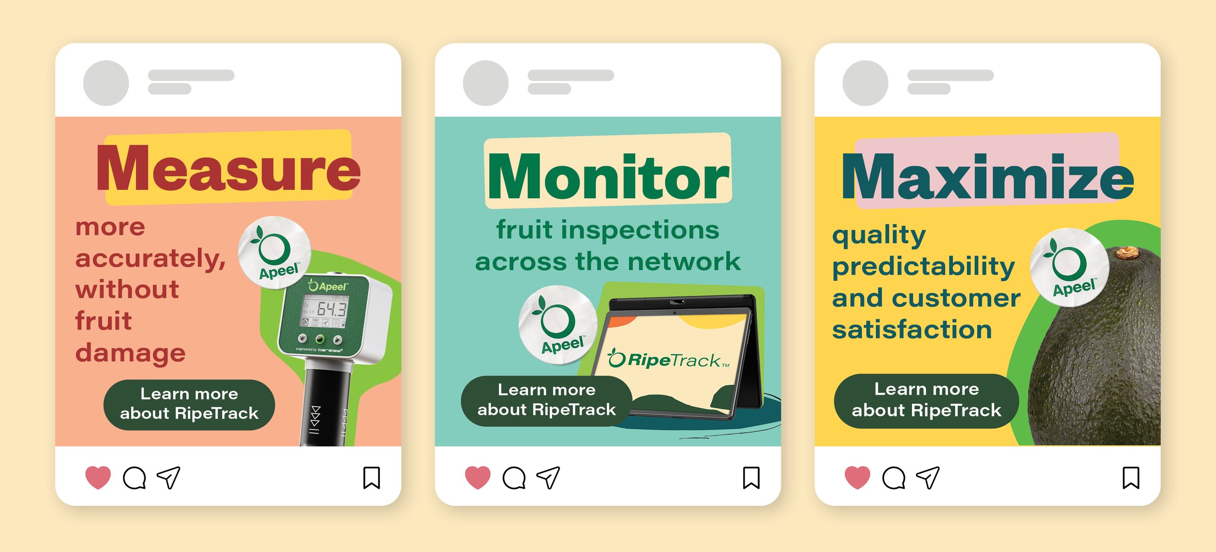 We developed the creative platform Measure, Monitor, Maximize to clearly communicate the three core benefits of RipeTrack, using it as the unifying headline across all touchpoints. This framework shaped the visual identity for the campaign, from trade show graphics to digital assets, while ensuring each individual tool could be showcased within the broader system. Our design approach drew on Apeel’s existing visual language, bright colors, organic shapes, and playful textures, reimagined to give RipeTrack a distinct but connected look.
