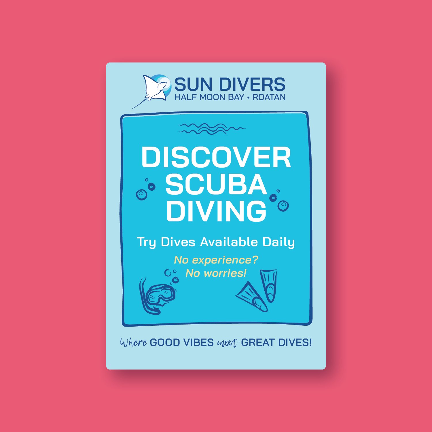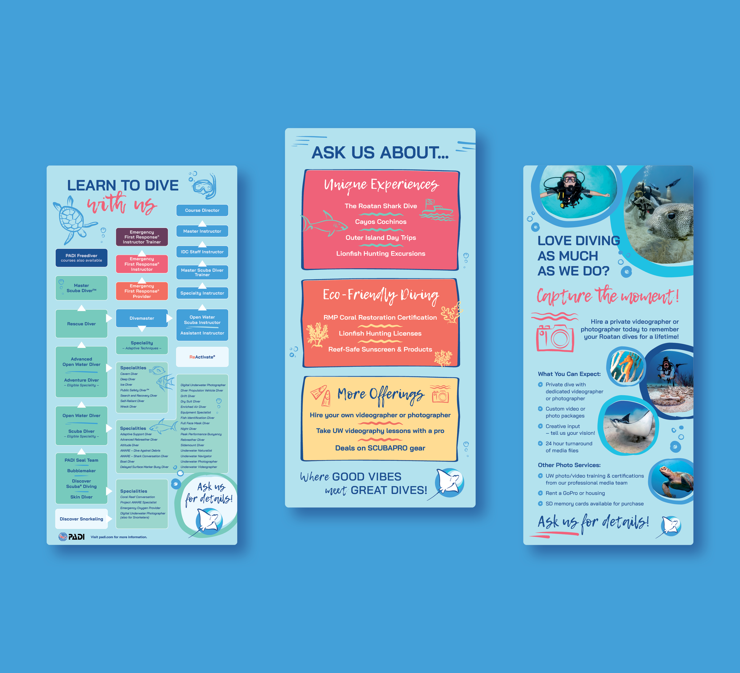 Sun Divers was entering a new chapter and needed a refreshed brand identity. As Roatan’s first PADI Eco Center, they needed a look that felt vibrant and current, while staying rooted in the dive center’s trusted legacy. The challenge was to create a visual system that balanced professionalism with personality — something that could capture the excitement of next-level underwater adventures while also reflecting the relaxed, welcoming, and fun vibe topside.
